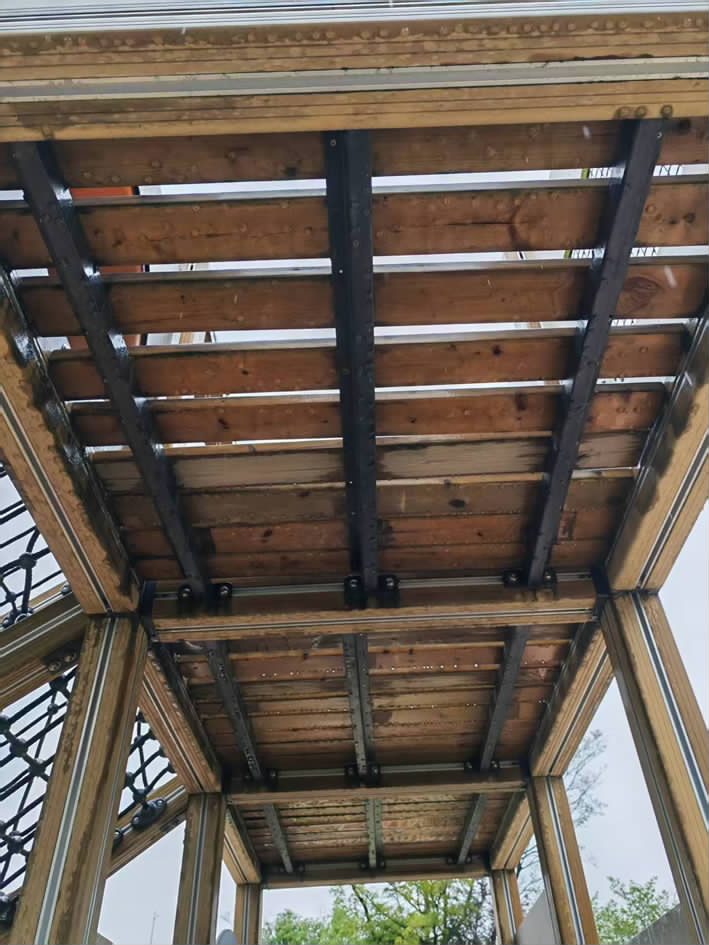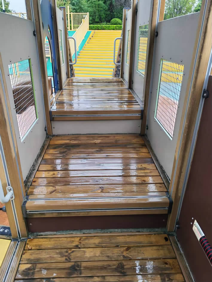那么,该木板是否已更换到位?昨天9时许,记者前往黄公望公园进行实地走访。受降雨天气影响,公园内暂未见孩童游玩。在市民提及的滑滑梯区域,记者观察到该滑滑梯为两小层结构,在第一层,经仔细检查发现,现场木板无破损痕迹,且木板拼接处平整牢固,无松动、开裂等问题。为进一步确认安全性,记者踩上木板测试,木板承重稳定,未出现摇晃或异响。此外,考虑到成人体重可能对第二层设施造成额外损耗,记者未登上第二层,但从下方抬头可见木板排列整齐,未发现明显破损。